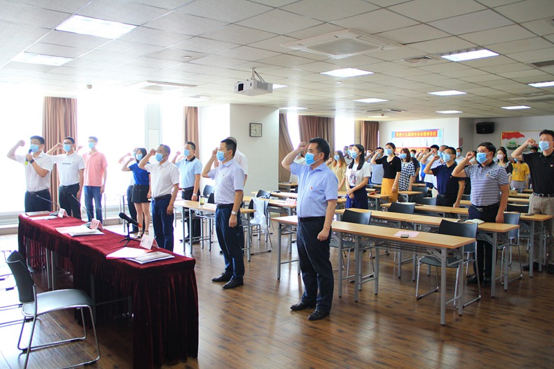会议在雄壮的国歌声中拉开帷幕。新老党员佩戴党徽、高举右拳,面对党旗进行了入党宣誓,重温了入党誓词。